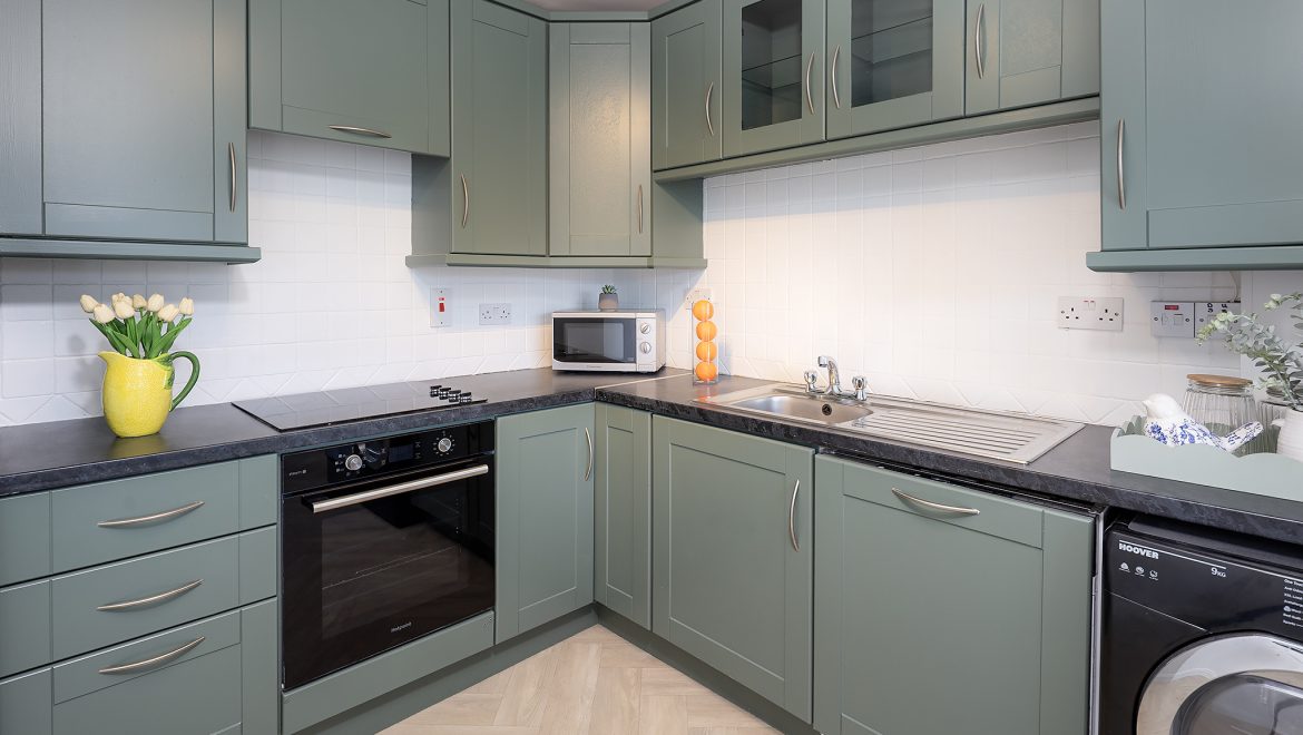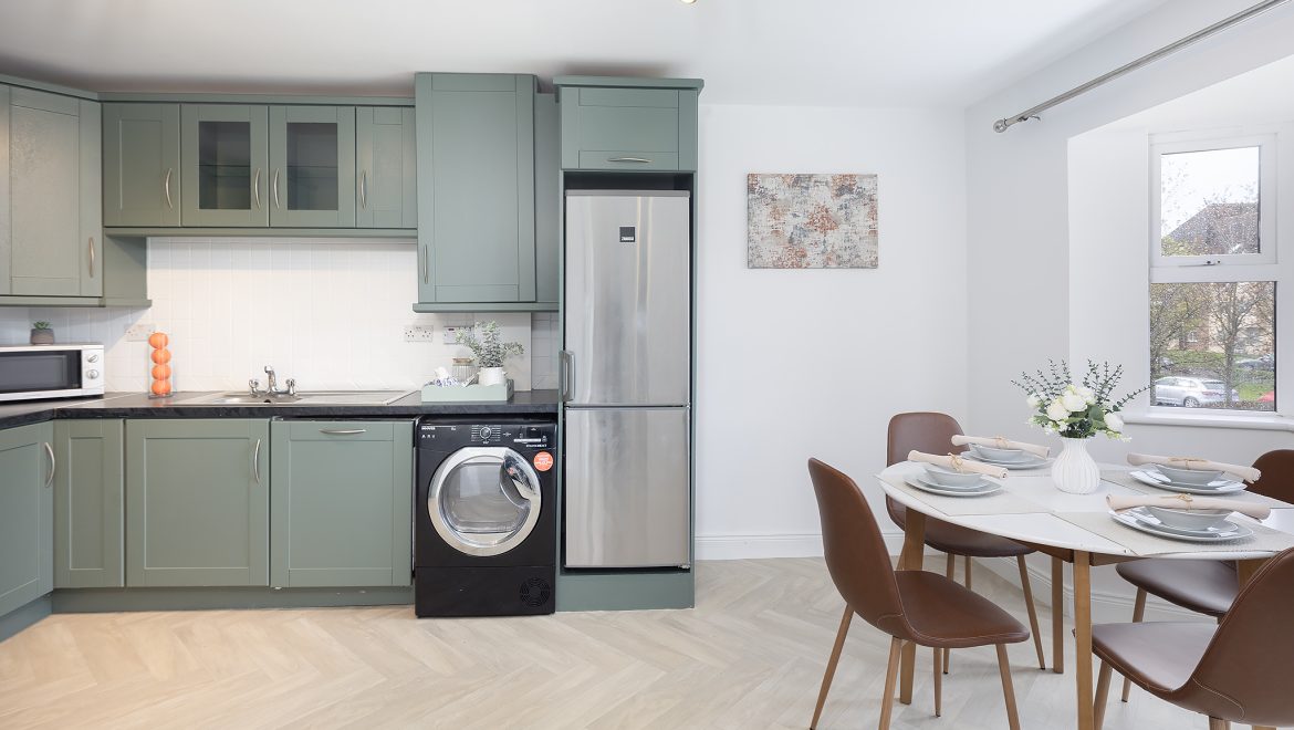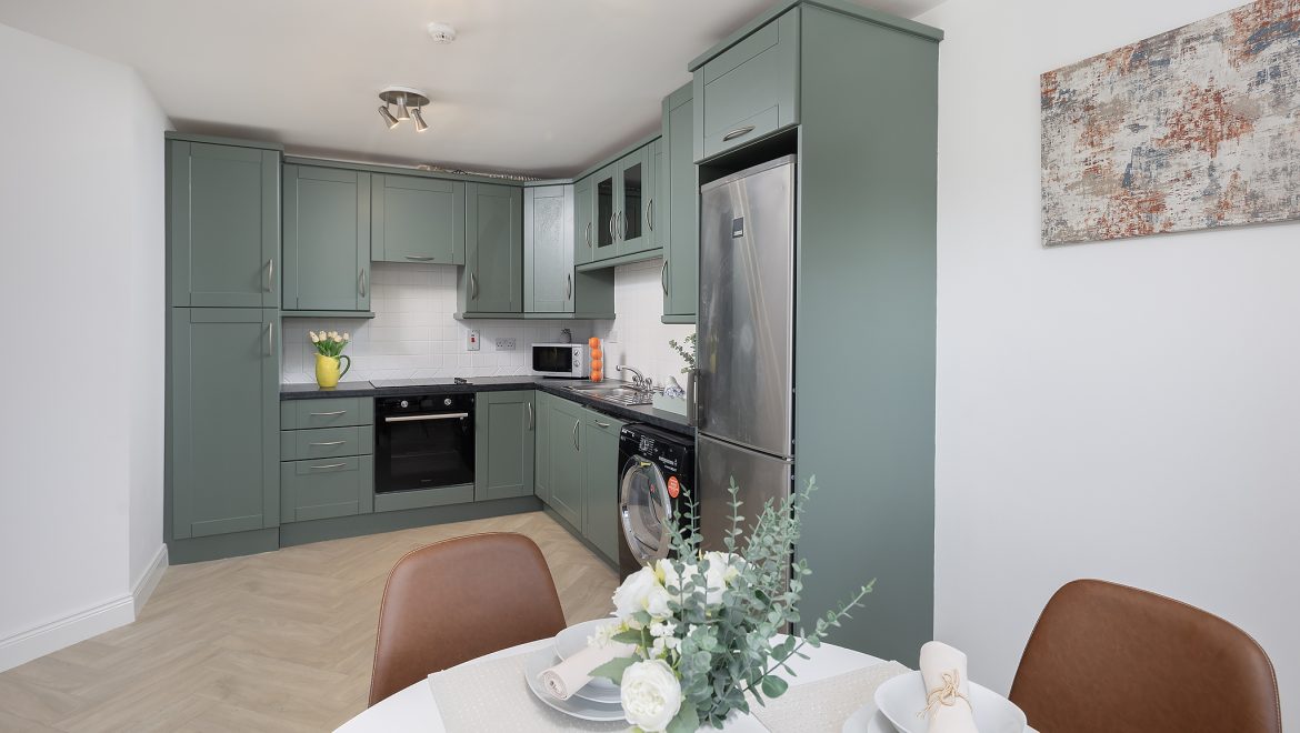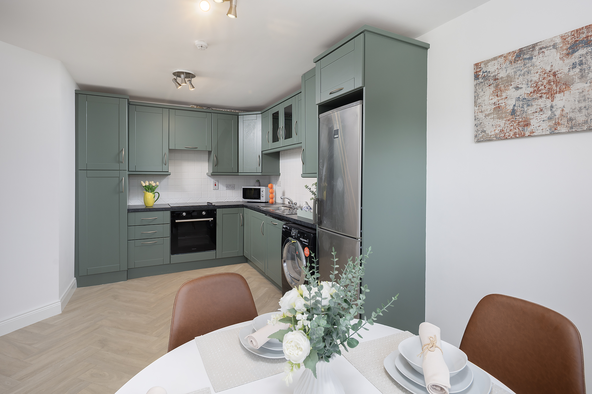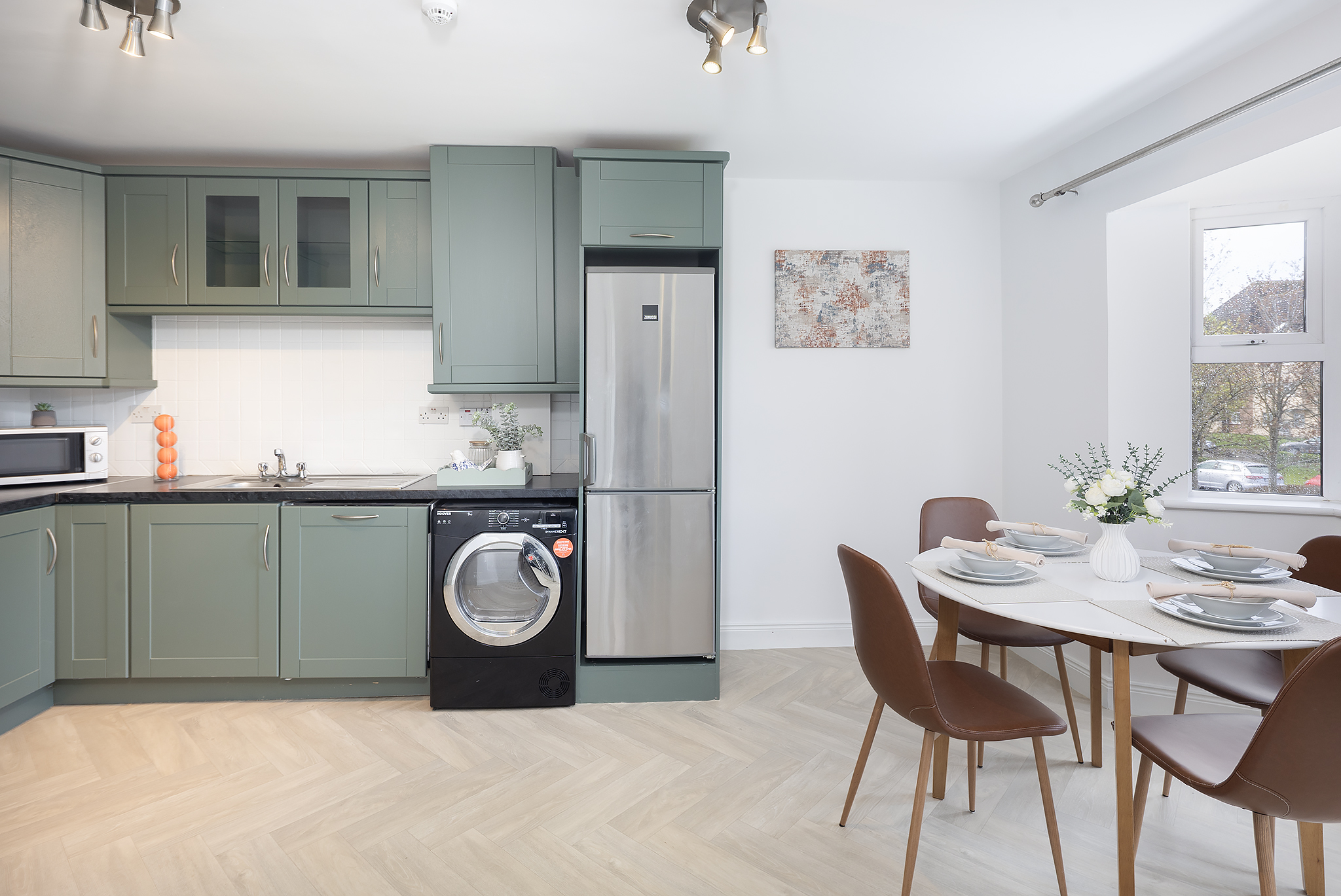 Wood effect vinyl flooring, shaker style kitchen units, ceramic hob, electric oven, cooker hood, integrated dishwasher, fridge/freezer, washing machine, blinds, light fittings