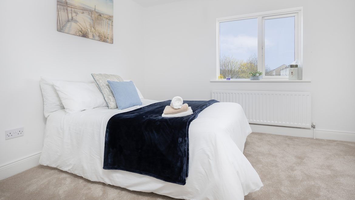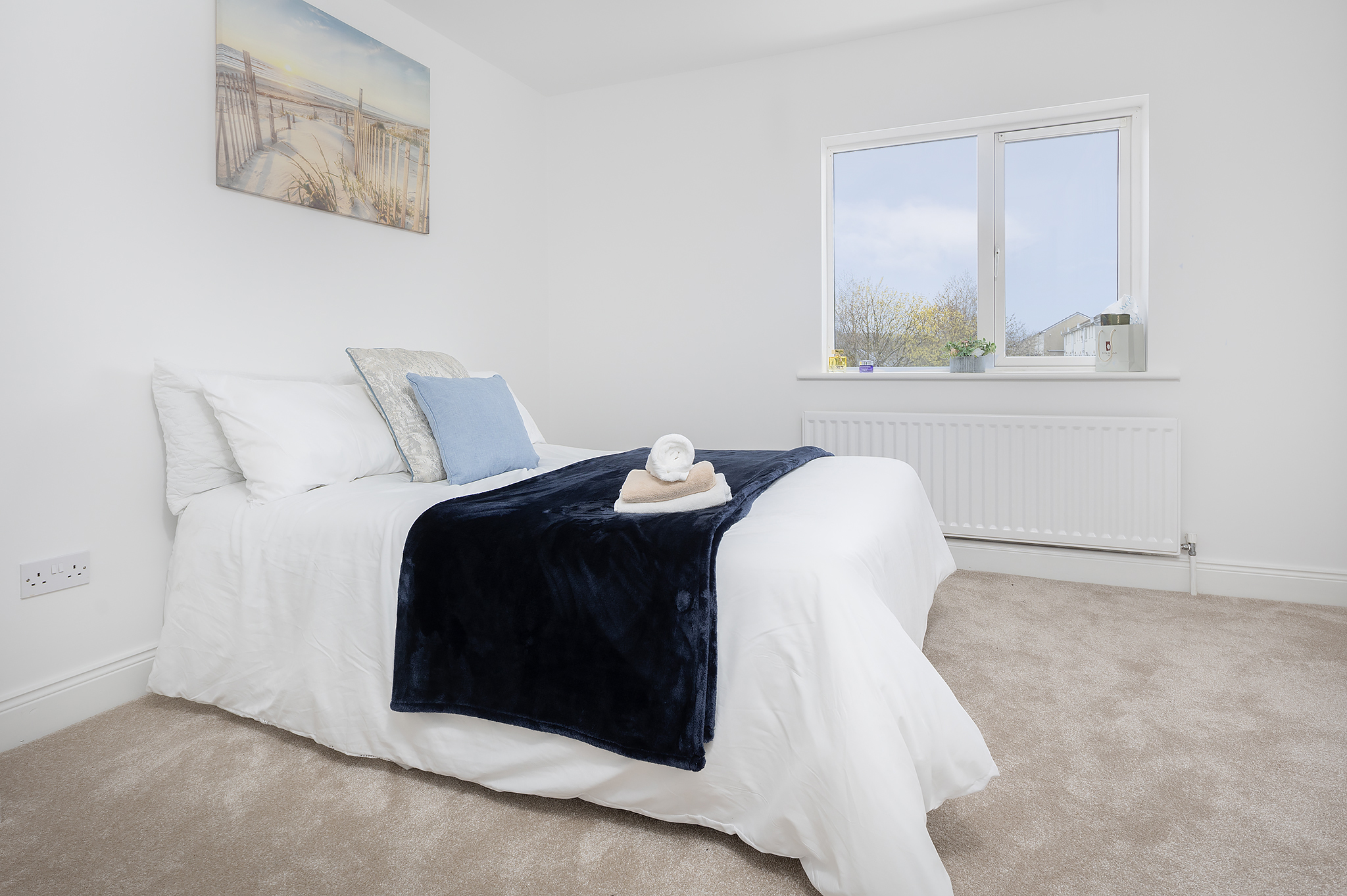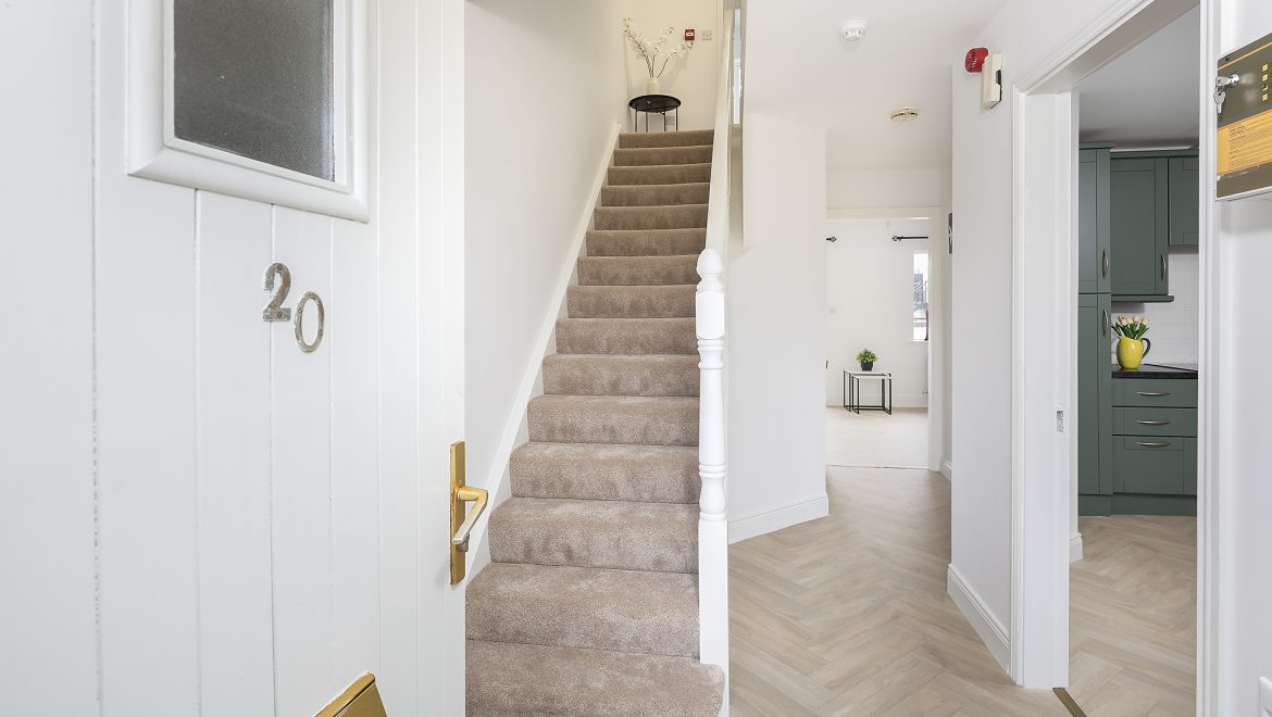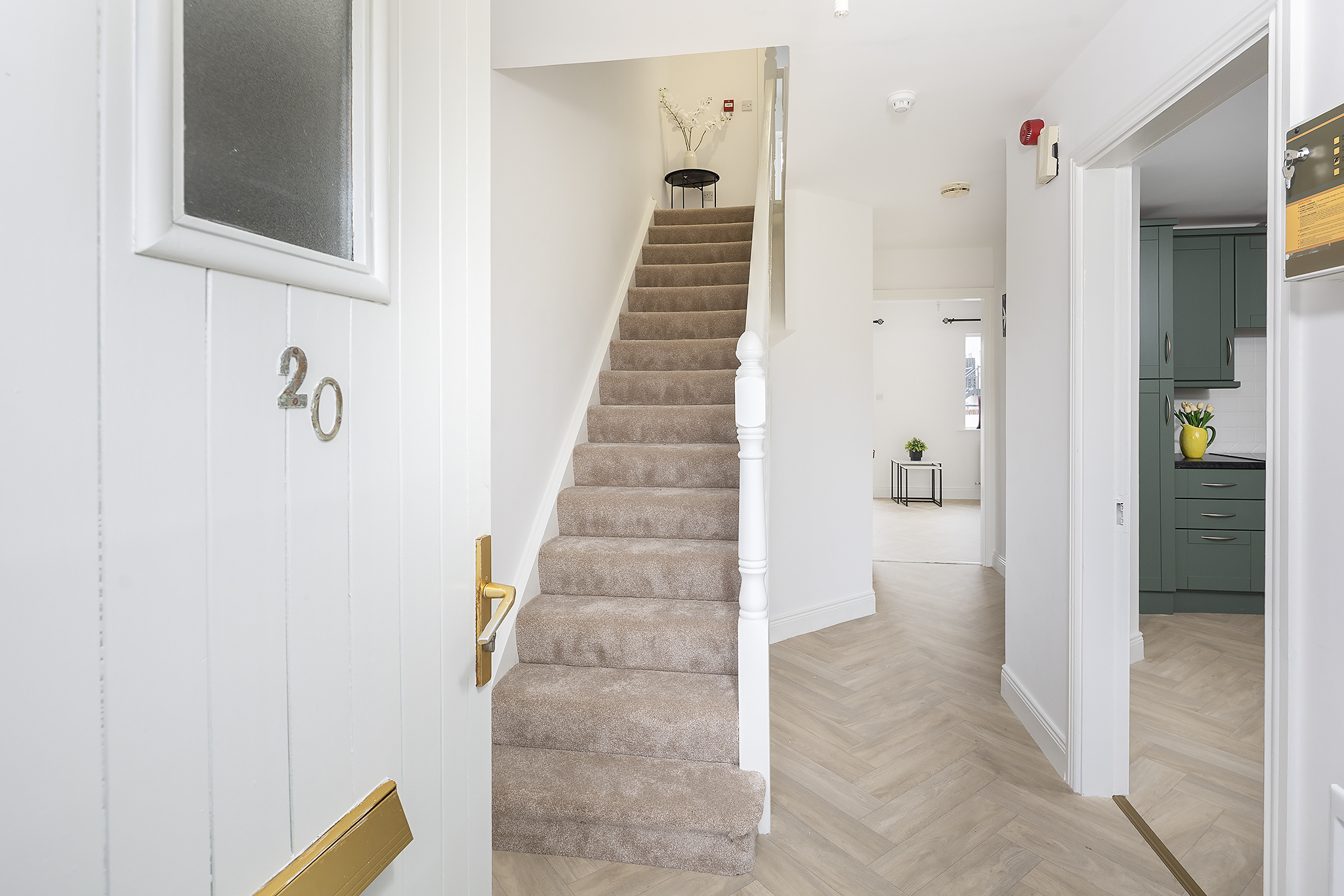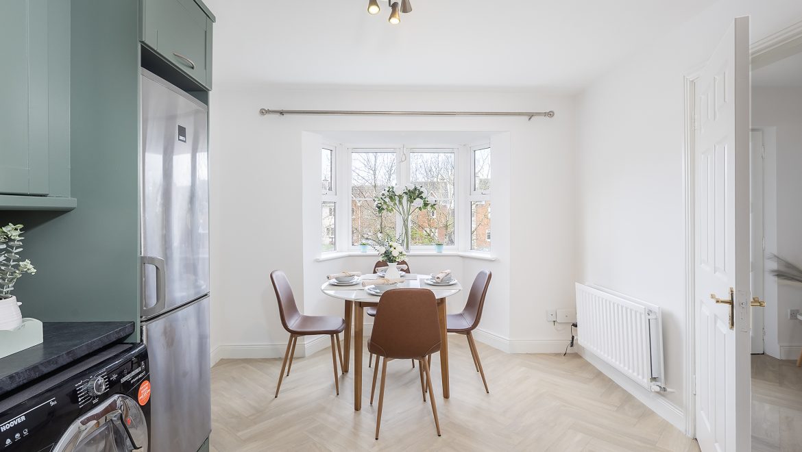 Wood effect vinyl flooring, shaker style kitchen units, ceramic hob, electric oven, cooker hood, integrated dishwasher, fridge/freezer, washing machine, blinds, light fittings