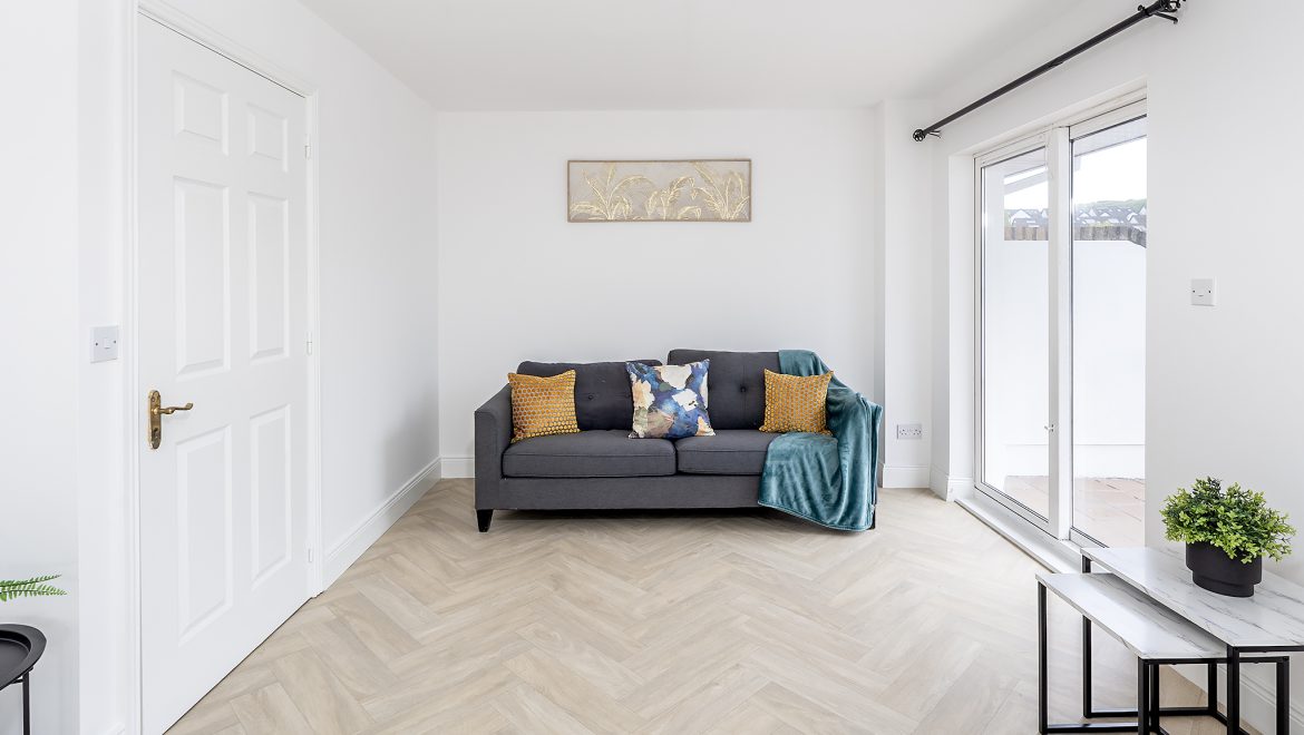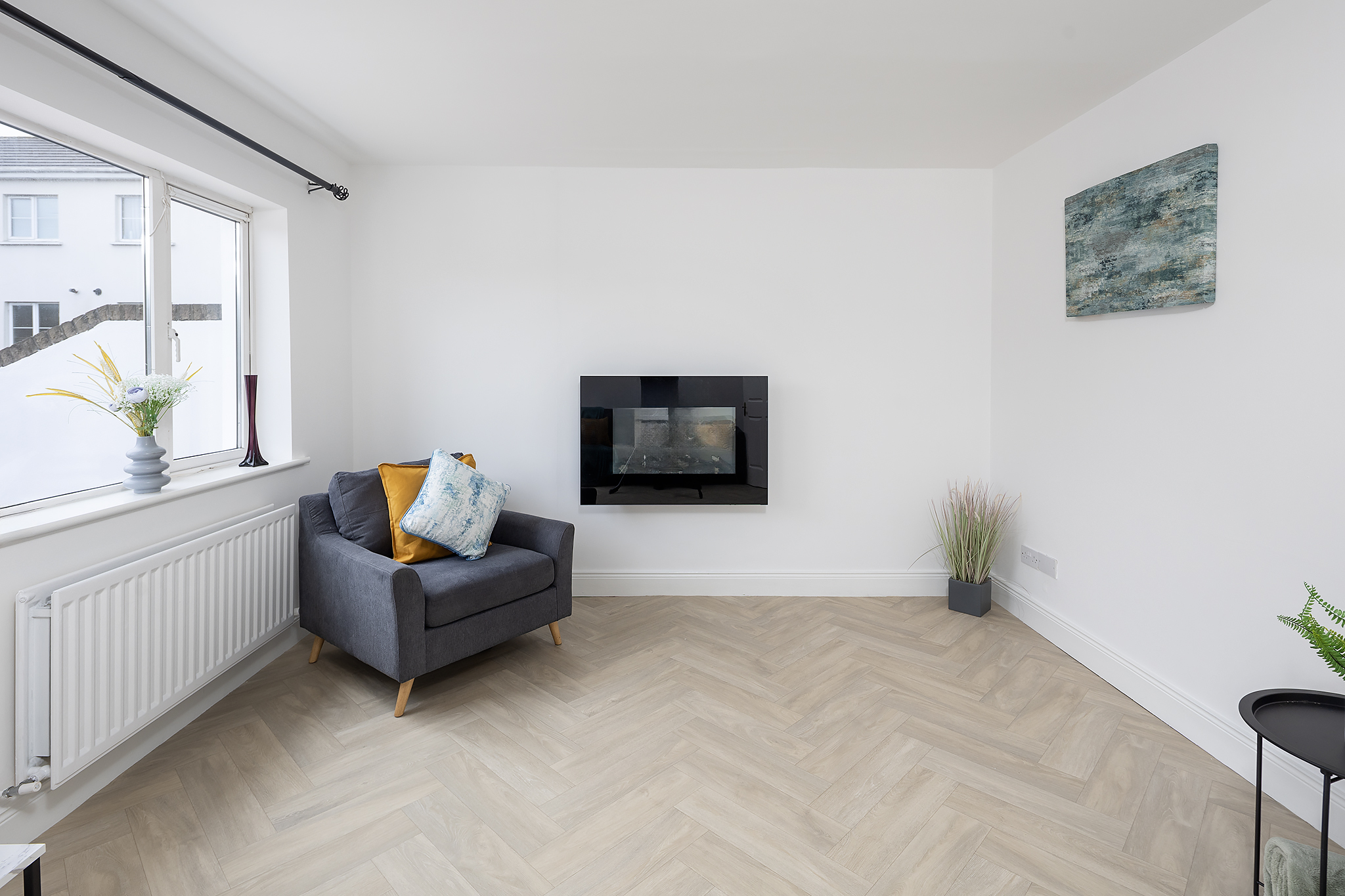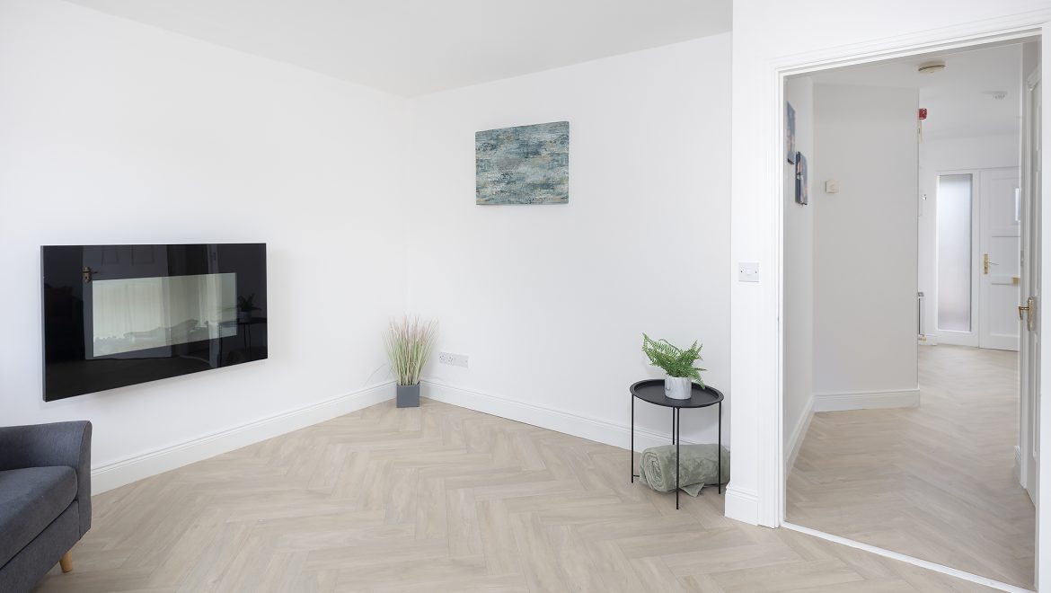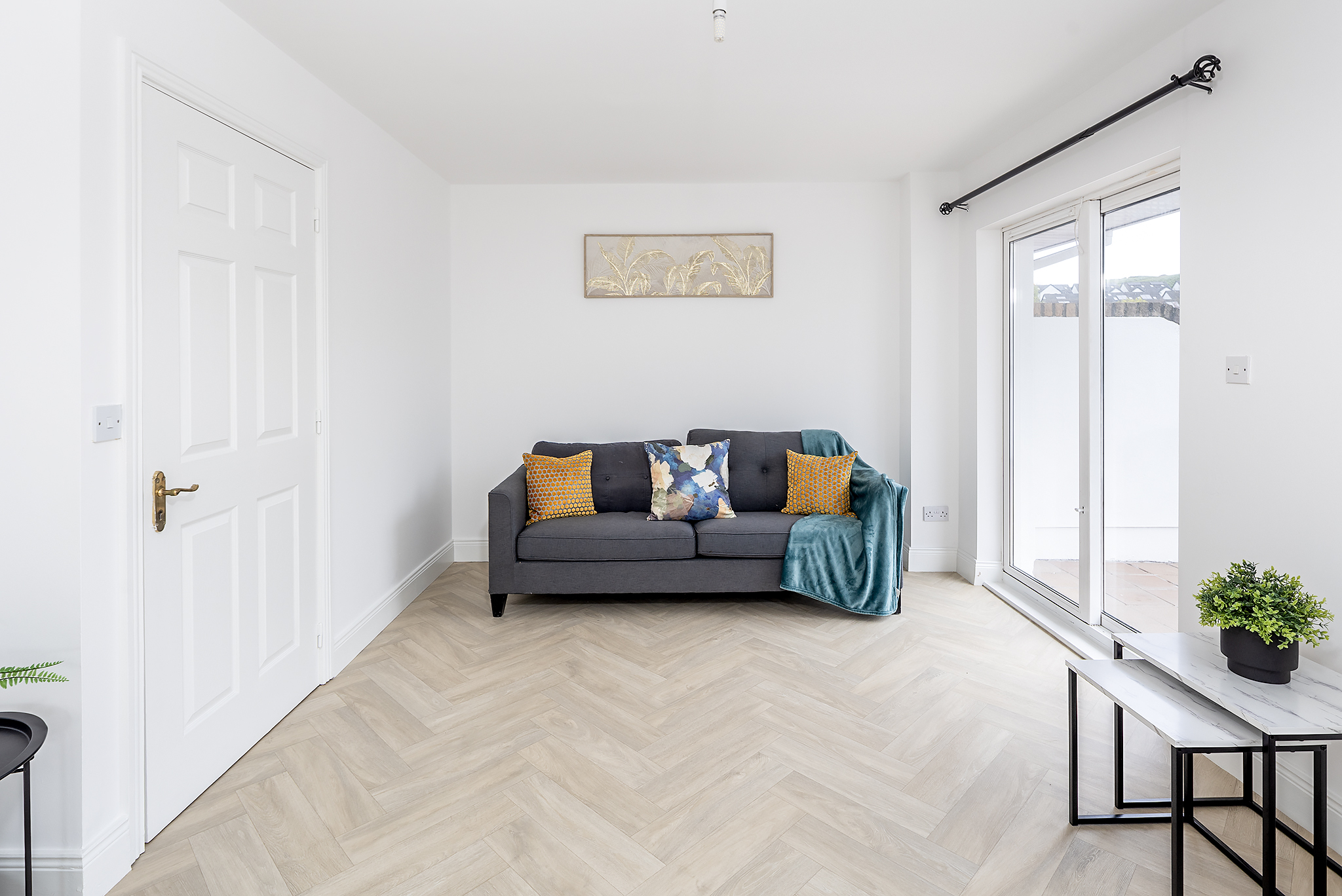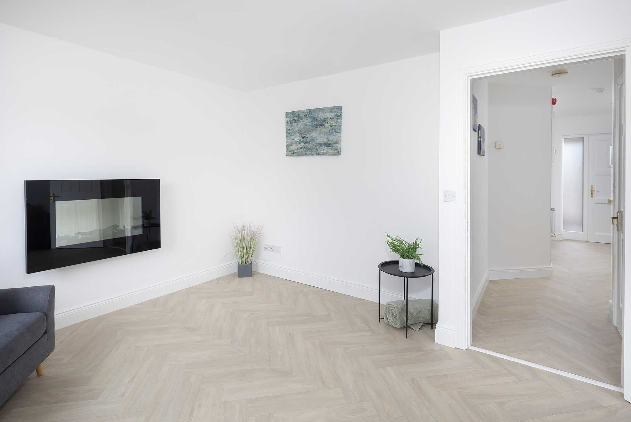 Wood effect vinyl flooring, electric fire, curtain poles, light fitting