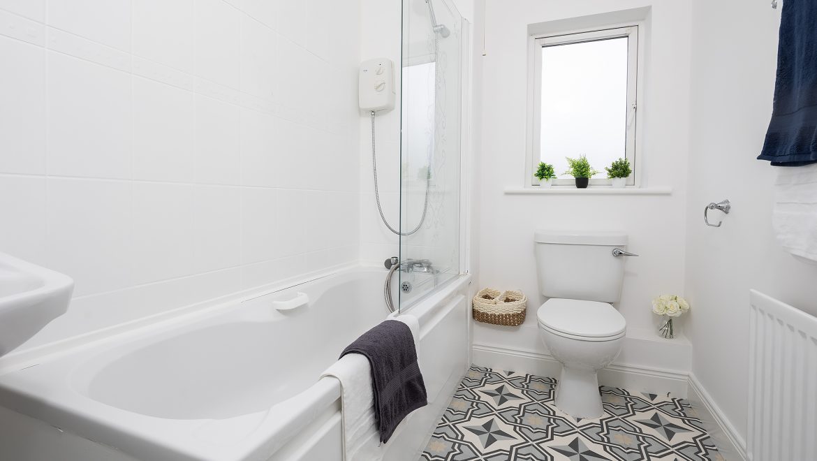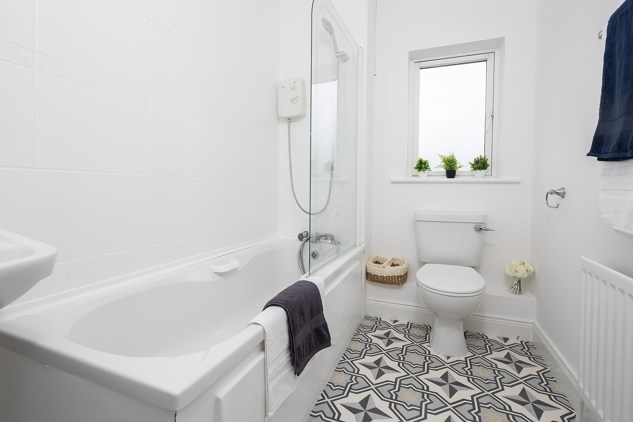 Vinyl flooring, tiled wall from to ceiling, bath with electric shower, w.c, w.h.b