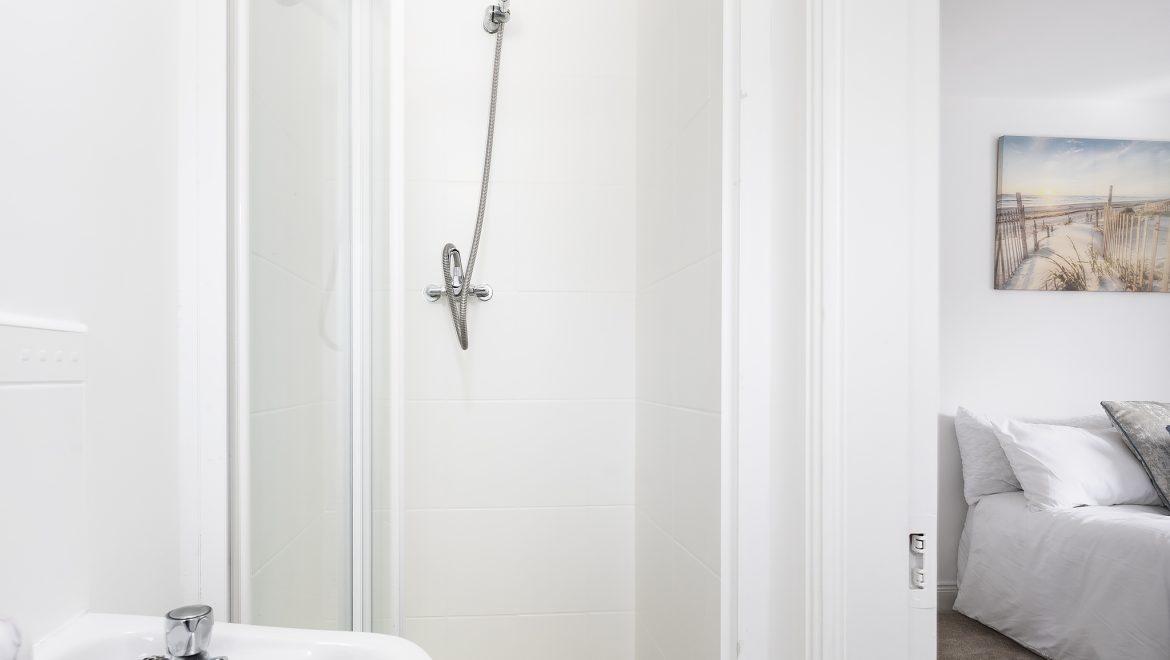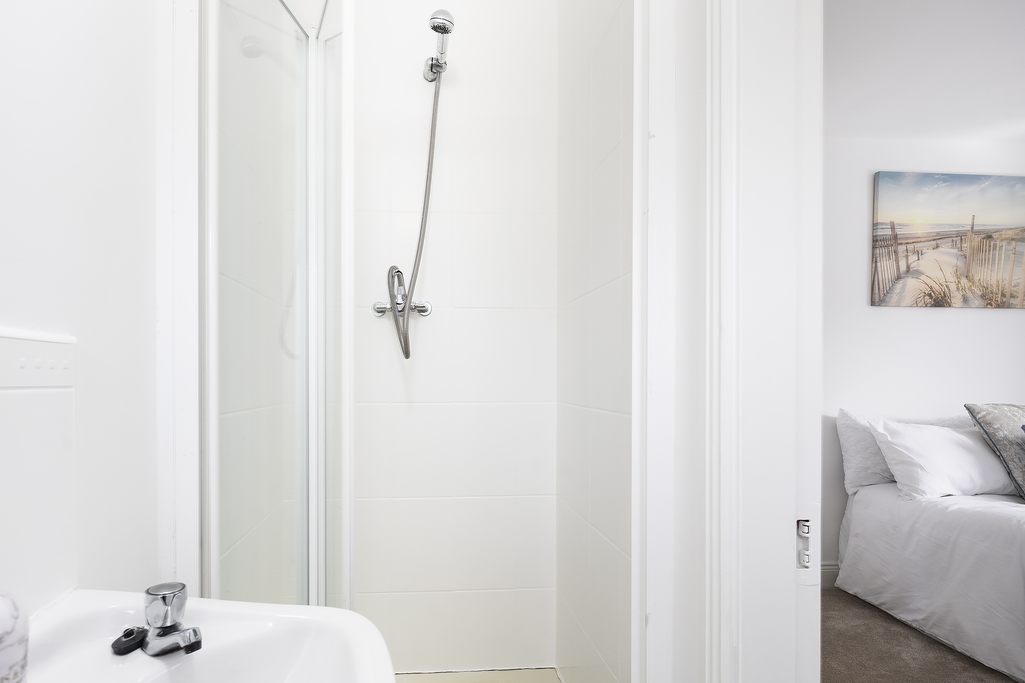 Vinyl flooring, w.h.b, w.c, shower, shaver light